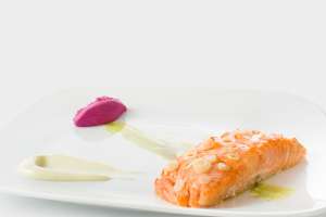 Salmone al lemongrass con quenel di rapa rossa e maionese piccante