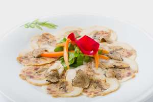 Sella di coniglio con tartufo nero grattuggiato fresco, valeriana e carote julienne
